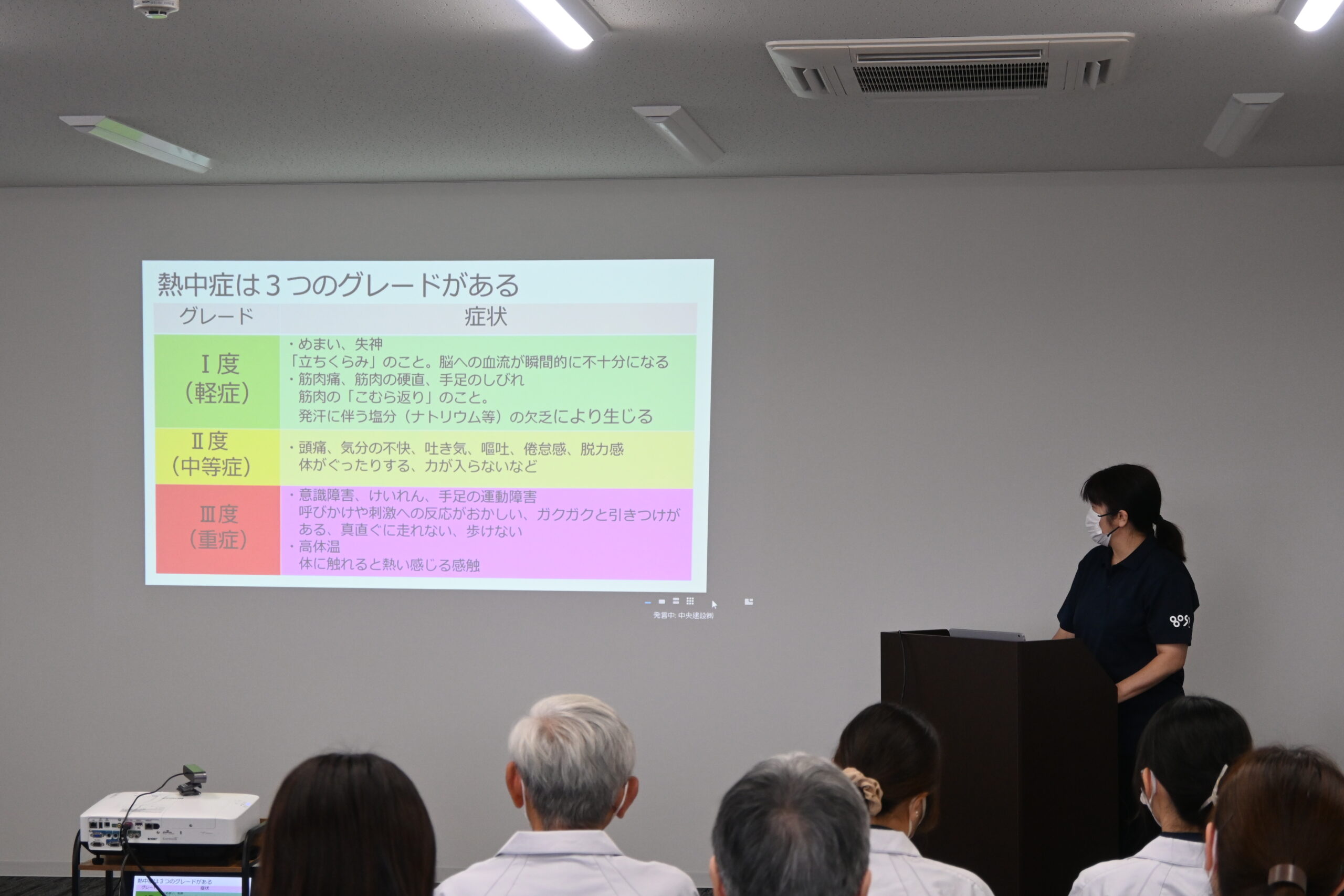 ①意識の確認 ②涼しい場所へ移動 ③水分補給(スポーツドリンクなど) ④身体を冷却(動脈を冷やす、水をかけてあおぐ)